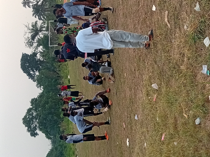 The image displays an outdoor, unkempt sports field within the city of Unknown, Chad