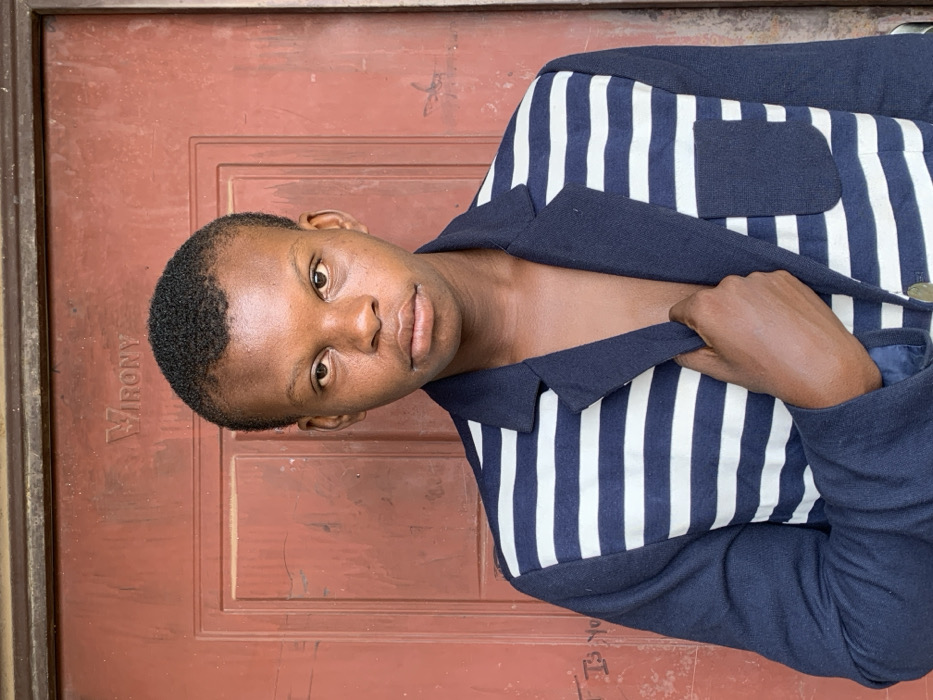An individual with dark skin, short, dark, textured hair, and a neutral expression stands facing the camera in the city of Ikorodu, Nigeria