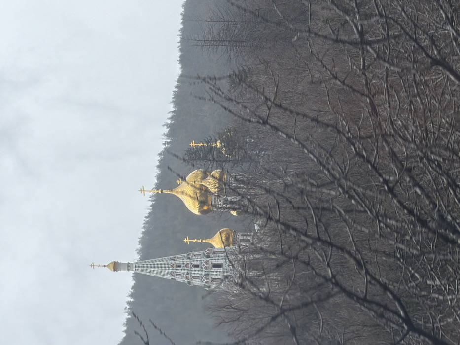 The image displays the Shipka Memorial Church in Shipka, Bulgaria, viewed through a dense foreground of bare, dark tree branches. The church features a tall, slender bell tower or spire with a white and reddish-brown patterned facade, topped by a golden Orthodox cross. To the right of the spire, several gold-domed structures, each surmounted by a golden Orthodox cross, are visible. The church is situated against a backdrop of hills densely forested with a mix of evergreen and leafless deciduous trees. The sky is uniformly overcast and gray, providing diffused light across the scene. No individuals or specific actions are depicted.