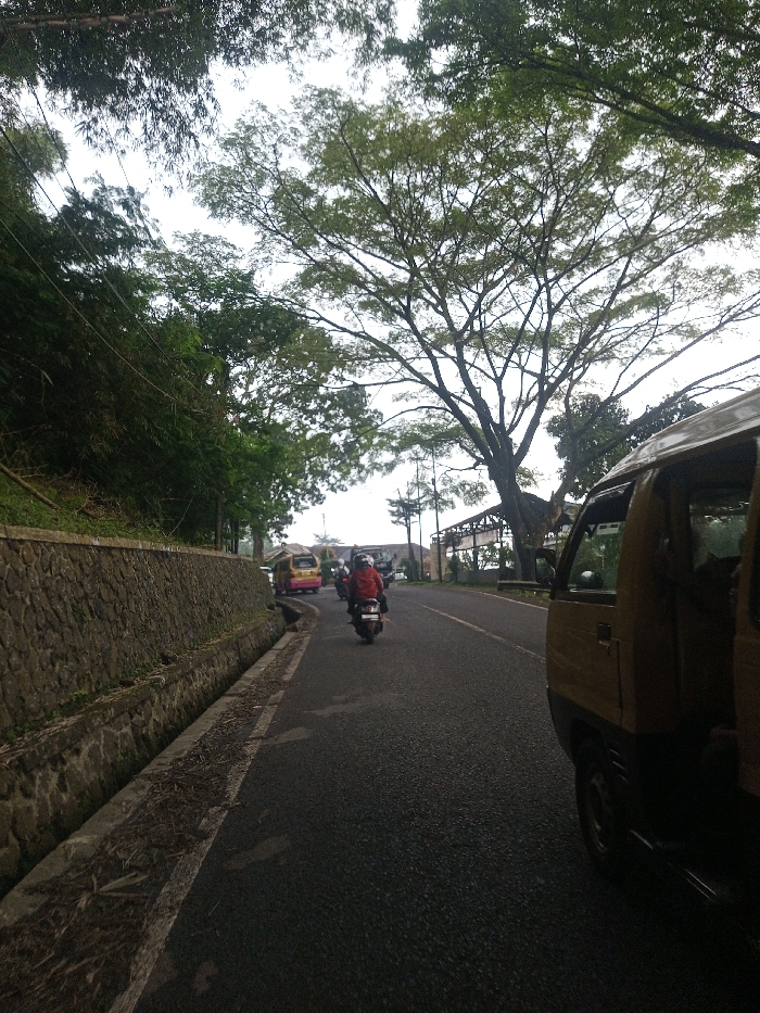 The image depicts a road scene in Sandamal Eliya, Sri Lanka, under an overcast sky. In the immediate foreground on the right, the front-right portion of a light-colored van or minivan is visible, with its passenger-side door appearing open. The road surface is black asphalt, extending into the midground and curving gently to the right. A single solid white line marks the left edge of the road, adjacent to a concrete drainage ditch, which is partially filled with debris. To the left of the ditch, a stone-faced retention wall rises, topped with dense green foliage, including bamboo-like plants. In the midground, an individual wearing a red jacket and a helmet is operating a red motorcycle, traveling away from the camera in the center of the road. Further down the road, another motorcycle with two riders is visible, followed by a yellow van featuring a pink stripe. Utility poles and wires are visible on the left side, above the foliage. In the background, the road leads towards an area with various buildings and structures, including a large, open-sided structure with a roof. The sky is uniformly light grey and overcast. A large tree with a widespread canopy of green leaves and visible branches dominates the upper-center and upper-right portions of the frame, partially obscuring the sky. Dense green vegetation covers the hillside on the far left.