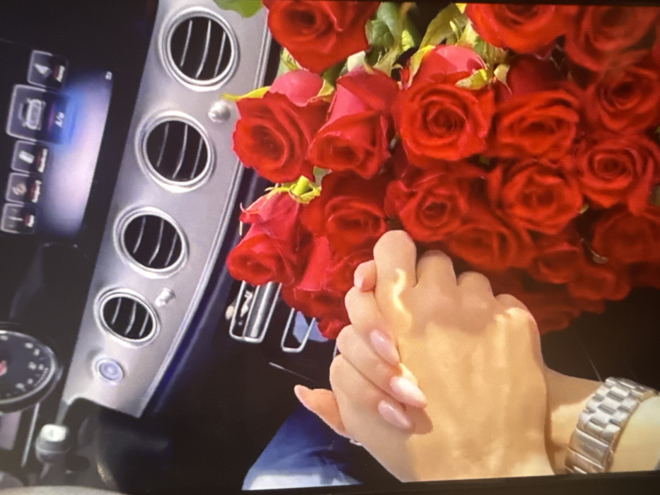 The scene depicts the interior of a modern vehicle, specifically the dashboard area, located in Lukovit, Bulgaria. A large bouquet of deep red roses with visible green foliage occupies the right side of the frame. In the lower-left, two light-skinned hands are clasped together; the upper hand, exhibiting long, manicured nails with a pink ombré, wears a silver-colored metallic link watch on its wrist. The vehicle's dashboard is visible in the background, featuring multiple circular air vents with chrome trim, a dark blue/black panel, and an illuminated digital infotainment screen displaying various icons and text. A partial view of a blue fabric garment is discernible below the clasped hands.