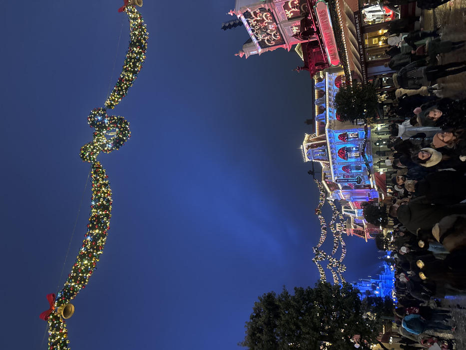 A nighttime shot displays a vibrant scene. On the right, a densely packed crowd of people appears, with illuminated buildings rising behind them. The buildings, decorated in red and blue hues, are adorned with intricate architectural details. To the left, a garland festooned with lights hangs in the air, curving in an "S" shape, with a decorative bell at its lower end. The sky above is a deep shade of blue.