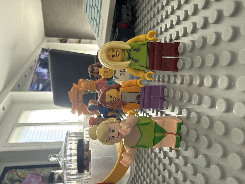 This image depicts a static arrangement of LEGO minifigures set up on a light grey studded baseplate within a residential interior in Limeil-Brévannes, France. In the foreground, three female minifigures are positioned upright. From left to right: 1. A minifigure with blonde hair in a bun, light pink skin, wearing a two-piece green swimsuit. Her arms are slightly raised, and she has a smiling facial expression. 2. A minifigure with auburn, wavy hair, light pink skin, wearing an open orange jacket over a grey shirt with a pendant, and dark purple pants. She also displays a smiling expression. 3. A minifigure with long blonde hair, light pink skin, dressed in a lime green hooded sweatshirt and dark red pants. This figure also has a smiling expression. In the mid-ground, several other LEGO minifigures are present in softer focus. These include a male minifigure wearing a white shirt with the number "10" printed on it, and various other figures with different hair colors and outfits. An orange arched LEGO structure is visible behind the central group of minifigures. The background reveals a brightly lit indoor environment. On the left, a large window with white horizontal blinds is visible, allowing natural light into the scene. A clear, multi-tiered glass object, possibly a decorative container, stands behind the leftmost minifigure. In the center-right background, a large, dark, rectangular object, consistent with a television screen or computer monitor, is present. To the far right, a light-colored object with a grid pattern, possibly a keyboard or part of a larger LEGO build, is partially visible. The overall setting is a domestic room.