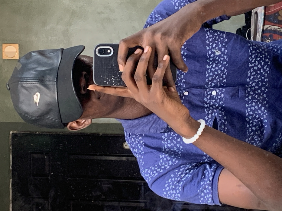 A dark-skinned male individual is depicted in a mirror selfie, partially obscuring his face with a smartphone