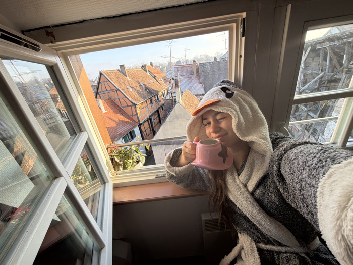 An individual, appearing female, is captured in a selfie taken from an indoor perspective, looking out an open, multi-paned window in Bouxwiller, France. She occupies the lower right and central portion of the frame, wearing a grey, black, and white striped, fluffy bathrobe featuring a hooded design resembling a duck or penguin, complete with black eyes and an orange beak. Her long brown hair is visible beneath the hood, and she displays a slight smile while winking with her left eye. She holds a light pink ceramic mug, adorned with irregular dark brown splatters, in her right hand, positioned at chest height. Below the open window, a white wall-mounted heating unit is partially visible, and a potted plant with green leaves and small pink blossoms rests on the windowsill. The exterior view from the window presents a dense arrangement of traditional Alsatian architecture under a clear blue sky. Dominant features include multiple half-timbered buildings with pitched, orange or terracotta tiled roofs. On the far right, an older structure exhibits extensive exposed wooden roof framing. Distant bare trees and various rooftop antennae are also discernible. Direct sunlight illuminates the scene, creating defined highlights and shadows.