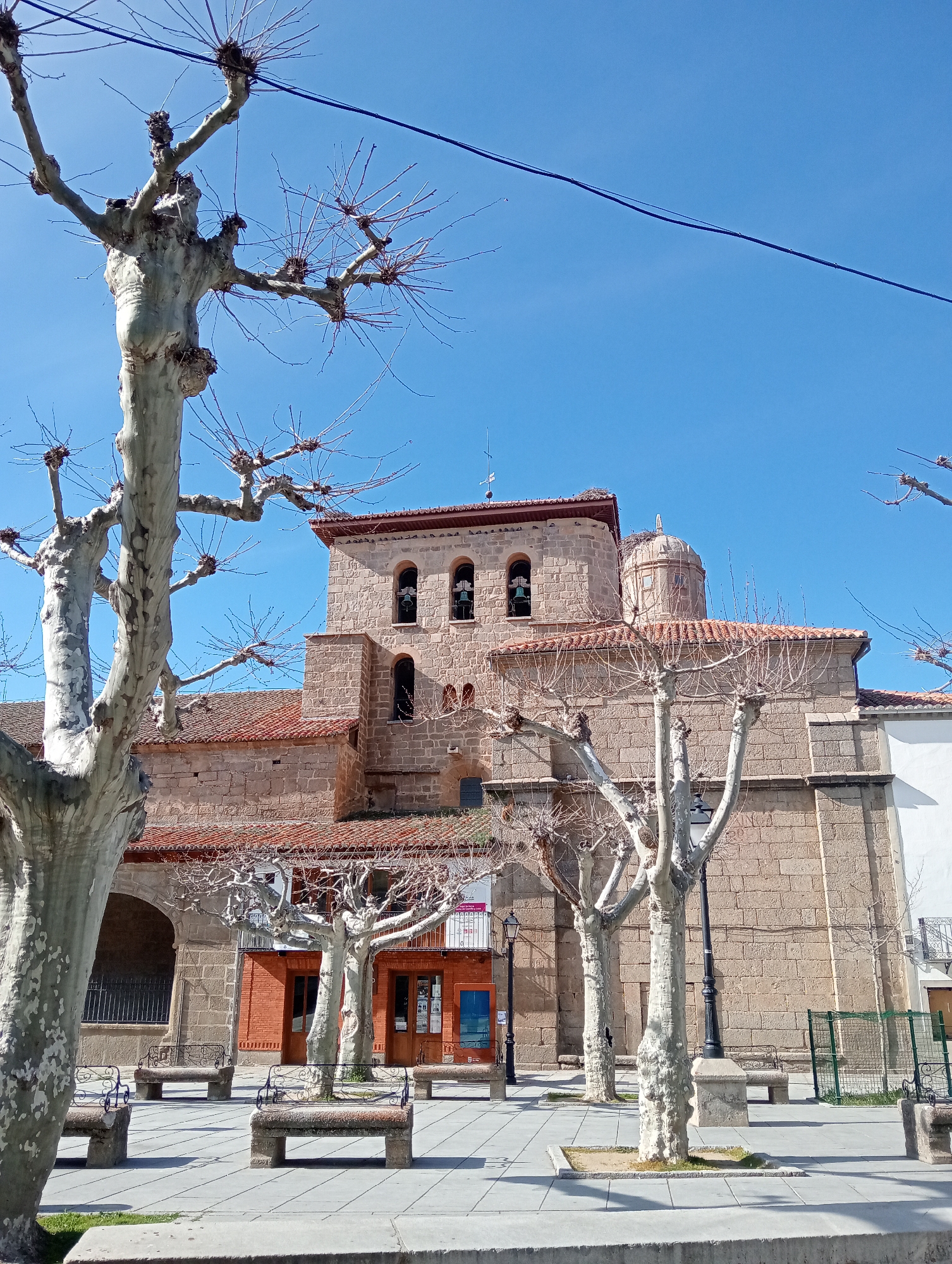 The image presents a forensic view of a public square in Piedrahíta, Spain, dominated by a large stone ecclesiastical structure under a clear, bright blue sky. The primary building, likely a church, is constructed from light brown sandstone blocks with a terracotta tile roof. It features a prominent bell tower on the left with three arched belfry openings, two of which contain bells. To the right of the tower, a circular dome with a small finial is visible. A substantial bird's nest, consistent with a stork's nest, rests on the roof of the bell tower, near a thin metal antenna or lightning rod. The foreground is a paved plaza composed of uniform grey square tiles. Numerous pollarded trees, characterized by their light grey, mottled bark and bare, knotty branches, are distributed across the plaza, casting distinct shadows. Several stone benches with dark, ornate metal backrests are situated on the paved surface. Two black, decorative streetlights stand among the trees. To the left, an arched entrance or passage is integrated into the stone building. A structure with a reddish-brown brick facade and dark wooden doors is partially visible behind the trees in the middle ground, while a section of a white building with a small balcony and a green metal fence appears on the far right. A single dark, thin cable traverses horizontally across the upper portion of the sky. The scene is devoid of human figures or discernible activity.