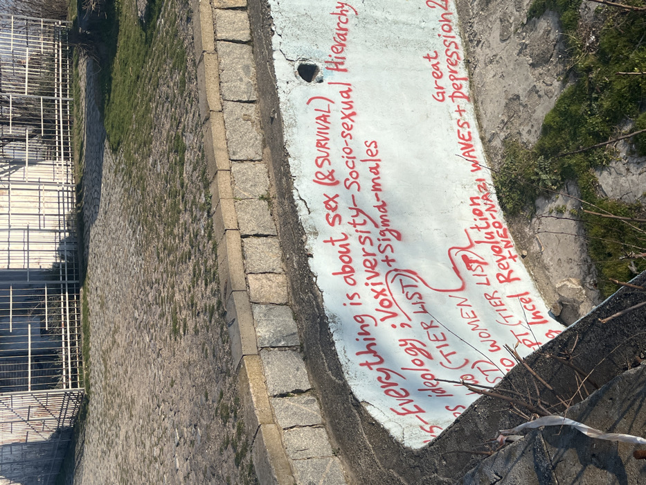 The image displays an outdoor scene in an unspecified area of Plovdiv, Bulgaria, featuring graffiti on a light blue or off-white concrete wall within what appears to be a sunken architectural feature. The graffiti, rendered in red spray paint, is distributed across the curved concrete surface. The most prominent text, centered on the wall, reads: "Everything is about sex (& SURVIVAL)" followed by "ideology ; Voxiversity - Socio-sexual Hierarchy (TIER LIST)? + Sigma-males". A large, stylized question mark or symbol follows "TIER LIST". Below this, positioned to the left and curving downward, is "WOMEN (TIER LIST)". Further to the lower right, the text continues with "Incel Revolution + NEO-NAZI WAVES + Depression 2". Separated above "NEO-NAZI WAVES" is the word "Great". The concrete wall shows signs of wear and minor cracking, and a dark circular drain hole is visible in the upper right section of the graffiti-covered area. Above the concrete wall, a retaining wall constructed from roughly hewn, light gray granite blocks supports a paved surface composed of individual cobblestones or setts. Sparse green grass grows between the stones of the paved area. In the background, behind the paved section, is a lighter-colored building partially obscured by a dark metal fence or grate. Bare tree branches or shrubs are visible near the bottom of the concrete wall and in the immediate foreground, with some loose white plastic debris entangled in the branches on the left. The scene is illuminated by bright sunlight from the left, casting shadows. No individuals are present in the image.