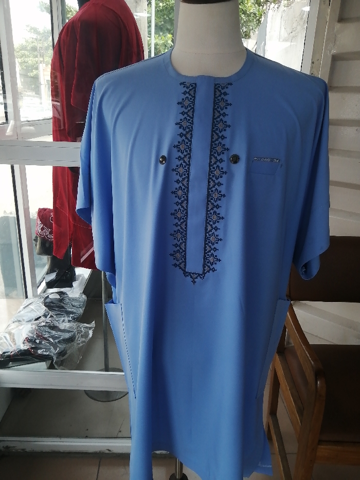 The scene depicts the interior of a clothing shop or boutique in Ilado, Nigeria. A light blue, short-sleeved male tunic, featuring black and gray geometric embroidery down the central placket, two dark circular buttons, and a patterned breast pocket on the wearer's right, is displayed prominently on a headless mannequin. A vertical slit pocket is visible on the wearer's left side of the tunic. In the background to the left, a red garment is visible on another headless mannequin. Further left, a large window reveals outdoor foliage and diffused daylight. Below the window, a white shelf holds items wrapped in clear plastic, alongside a black mannequin head wearing a red embroidered cap. A portion of a wooden chair with a dark brown seat is visible in the lower right foreground.