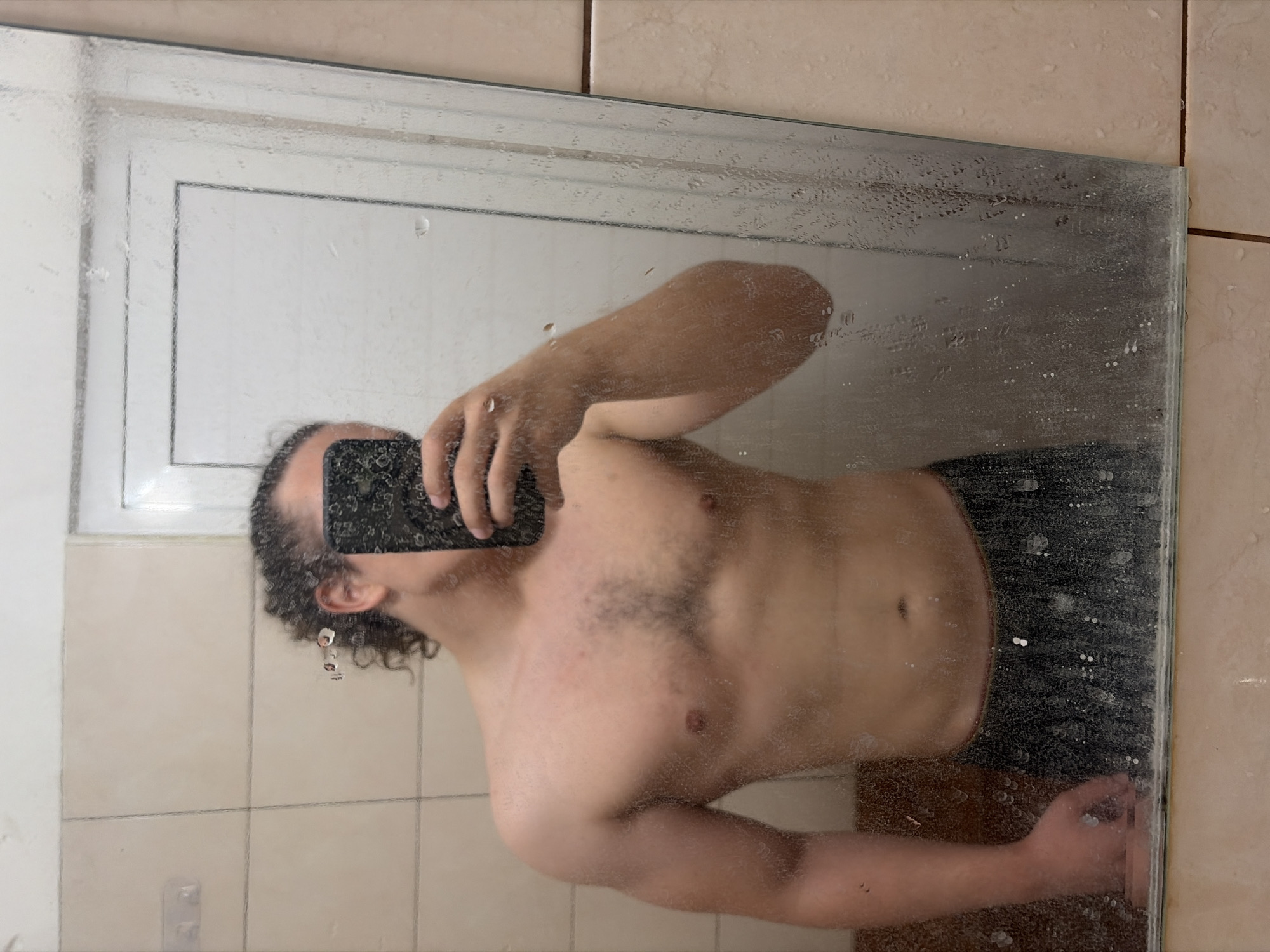 A shirtless person with curly hair is reflected in a steamy mirror, holding a phone to take a picture