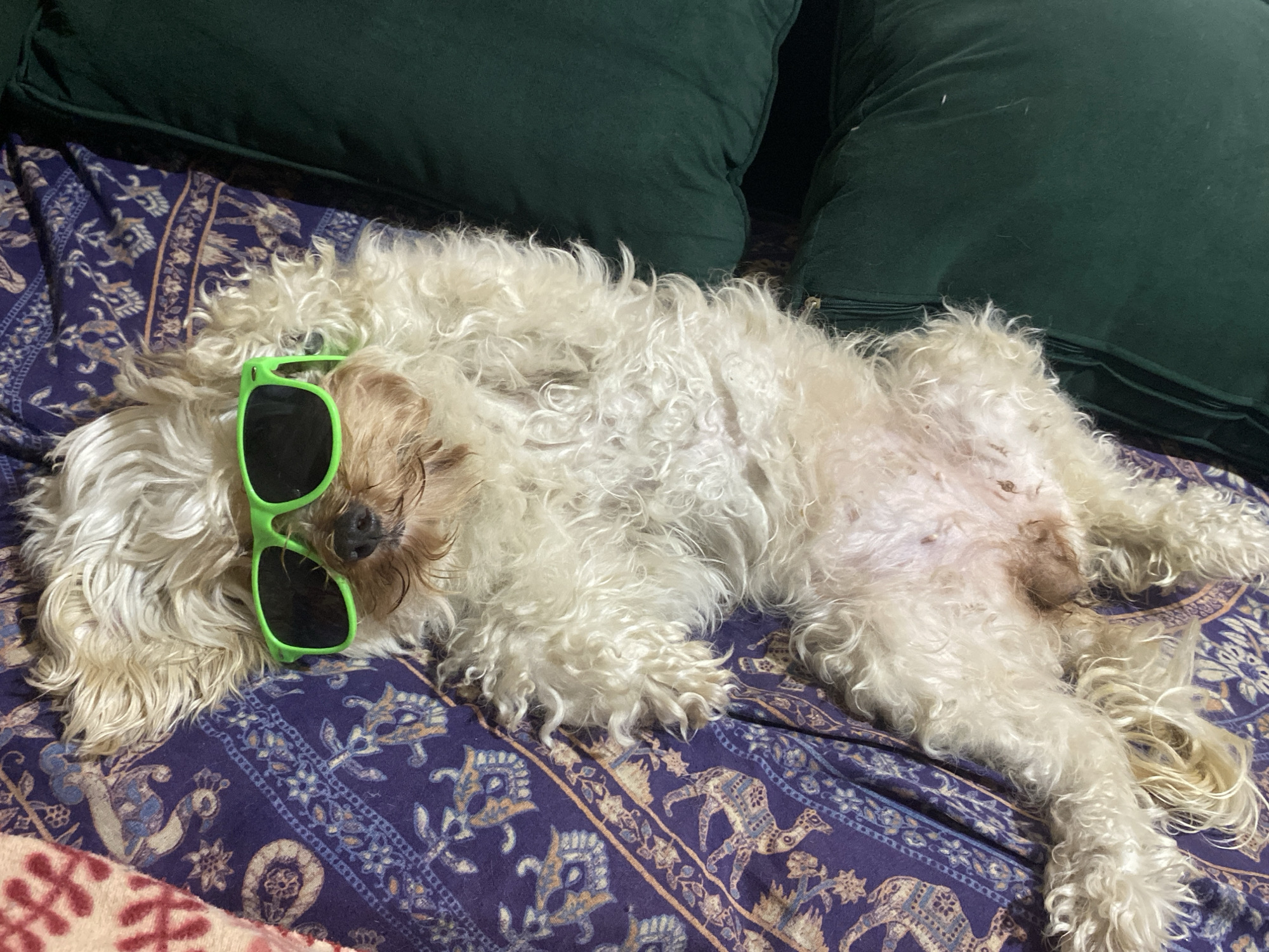 A medium-sized, white, long-haired dog is lying on its back on a blue and purple patterned bedspread. The dog is wearing bright green sunglasses. Two dark green cushions are visible at the top of the image behind the dog's head. Part of a patterned red and beige blanket is visible in the lower left corner of the image. There is no indication of this image being located in Wilde, Argentina.