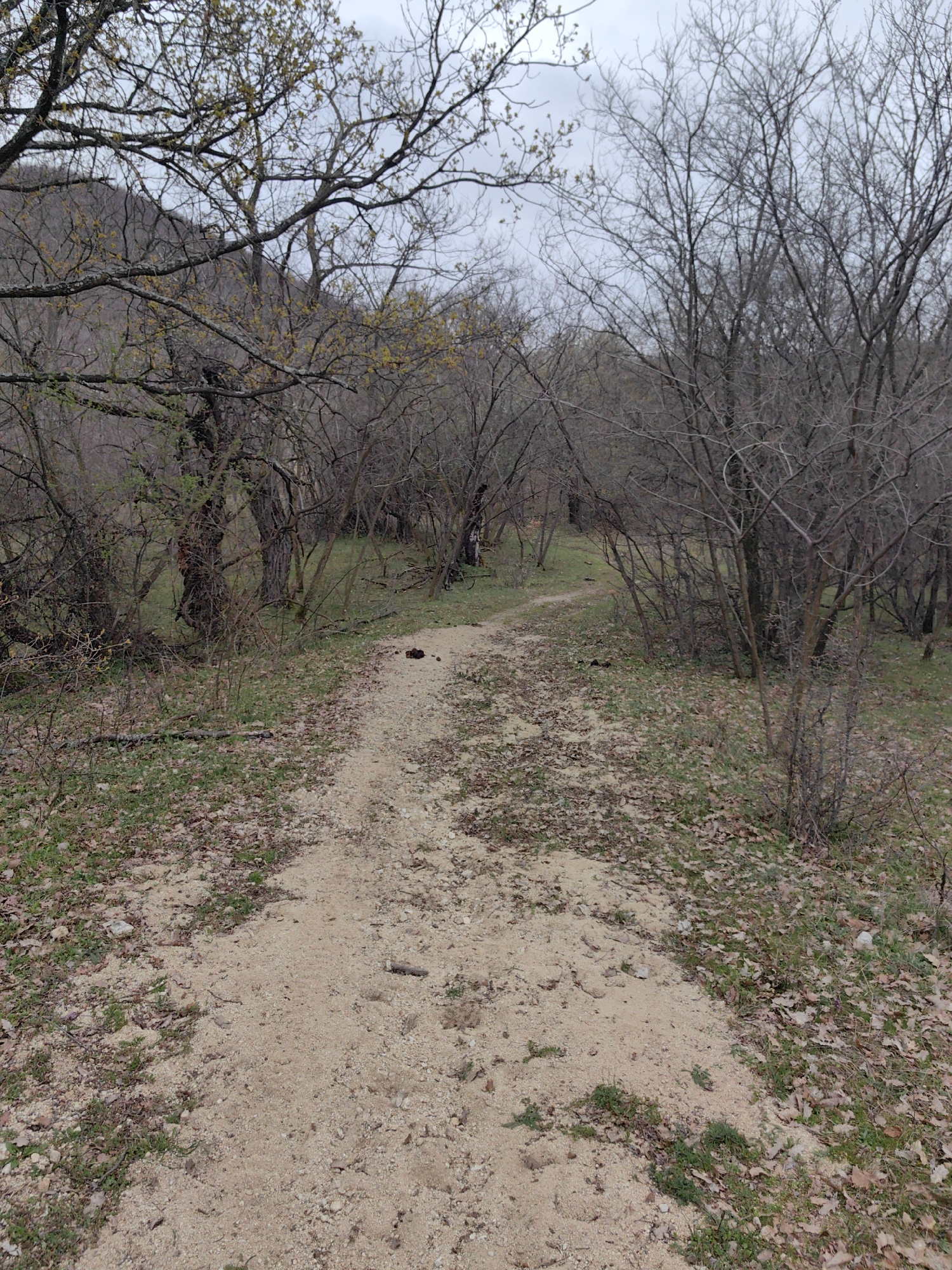 The image depicts a dirt path winding through a deciduous forest, potentially in Slatina, Bulgaria, though specific landmarks are not visible to confirm. The trees are mostly bare, suggesting either late autumn, winter, or early spring. Patches of green vegetation are emerging through the fallen leaves and on the sides of the path. No people are present. A mound of animal excrement sits in the center of the trail in the midground. Overcast sky.