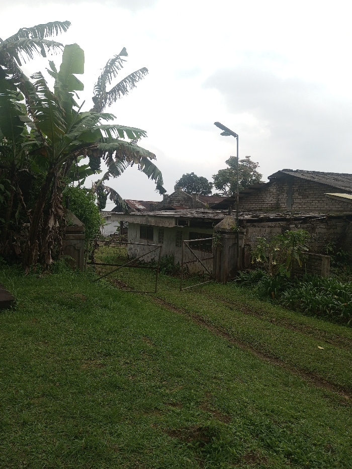 The image displays an outdoor scene in Ciherang, Indonesia, under an overcast sky. The foreground is dominated by unmanicured green grass, featuring two visible dirt tracks leading towards a property entrance. This entrance comprises a two-panel, rusted metal gate, currently partially open, situated between two weathered concrete gateposts. To the left of the gate, several mature banana trees with broad, partially damaged leaves are prominent. Immediately behind the gate, a single-story structure with white, possibly painted, walls and a compromised or incomplete roof is visible. To the right and slightly behind this structure, another building constructed from unpainted grey cinder blocks with an aged, dark roof is present. A dark-colored, modern streetlamp on a pole is positioned to the right of the gate structure, extending above the roofline of the adjacent building. Various overgrown plants, including one with distinctive white, bell-shaped flowers, are scattered around the gate and buildings. No individuals are present.