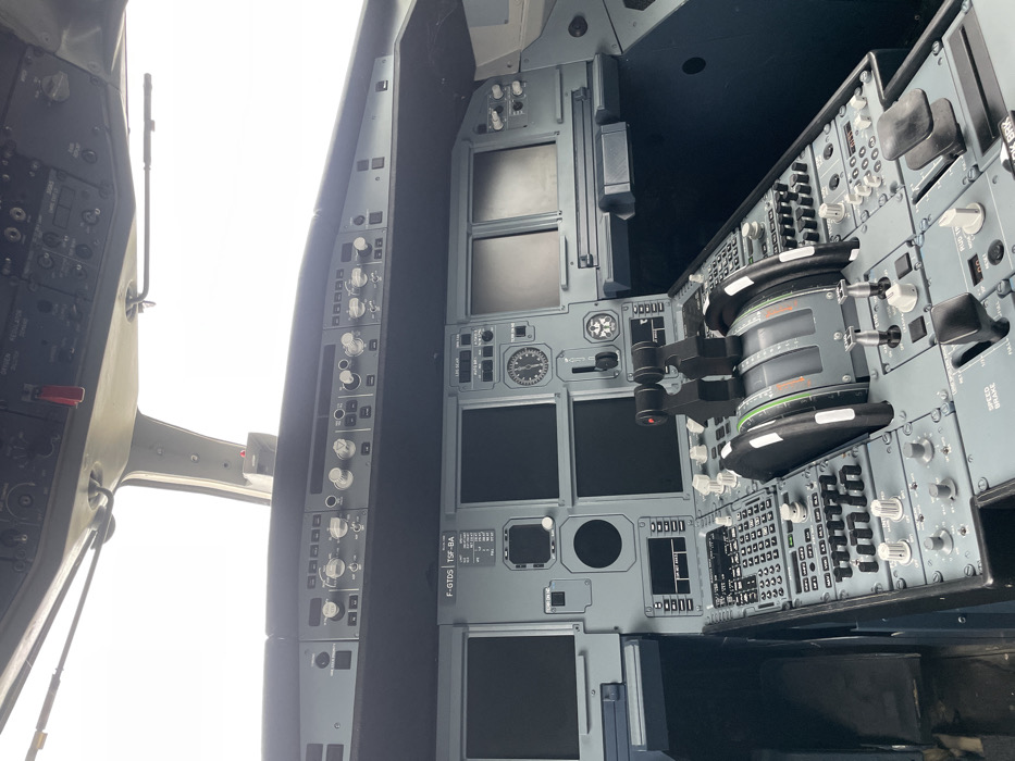 The image displays the interior of an aircraft cockpit, located in Pommeuse, France