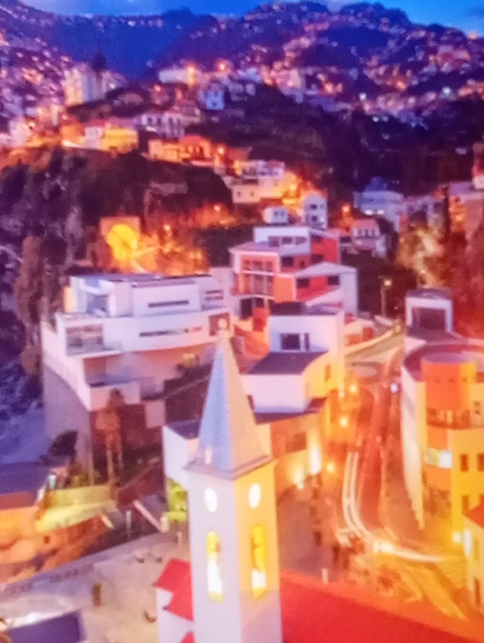 An elevated view captures a nighttime cityscape dotted with illuminated buildings. The scene descends from a distant hilltop ablaze with lights to a closer foreground featuring a church steeple prominently. The architecture is a mix of modern and traditional styles, with a blend of white and colored structures. Streetlights trace winding roads, adding depth and visual interest. The overall atmosphere is warm and inviting.