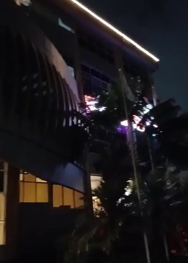 n exterior shot of a building at night. The building has modern architecture with a curved overhang at the entrance. The overhang is illuminated by several recessed lights. A horizontal strip of light runs along the top of the building. There are some trees in front of the building that partially obscure the view. The camera angle is low, looking upwards.
