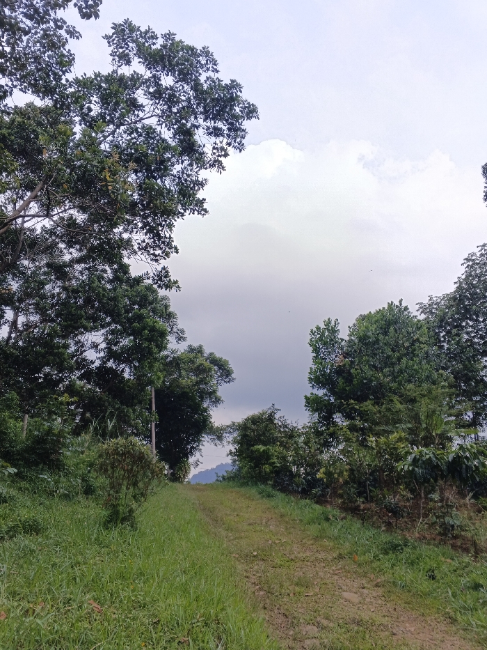 A grassy path leads upwards, framed by lush trees and vegetation. The sky is overcast, with dark clouds filling the expanse above. The path appears to be dirt, marked by visible tire tracks, suggesting occasional vehicle passage. A mountain or hill is visible in the distance, nestled amidst the green foliage. The overall impression is one of a quiet, natural setting.
