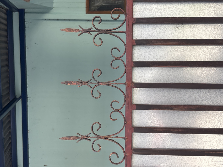 A rusted maroon metal gate features decorative ironwork on its left side. The ironwork consists of three spear-topped ornamental designs with curled elements. The gate itself has horizontal slats that appear to be made of a lightly textured, silvery material. A muted green wall provides the background. A portion of a blue-framed window is visible on the left edge.
