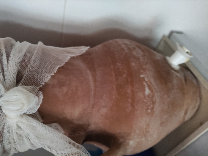 The image displays an unglazed terracotta botijo situated in Sucina, Spain. The reddish-brown earthenware vessel features a rough texture and is covered in white mineral deposits. Its upper opening is secured with a piece of white, loosely woven fabric, tied into a knot at the top. A white plastic spigot is integrated into the lower front-right side of the pot. The botijo rests on a light-colored, flat surface, against a plain, light-toned wall visible in the background. No individuals are present in the scene.