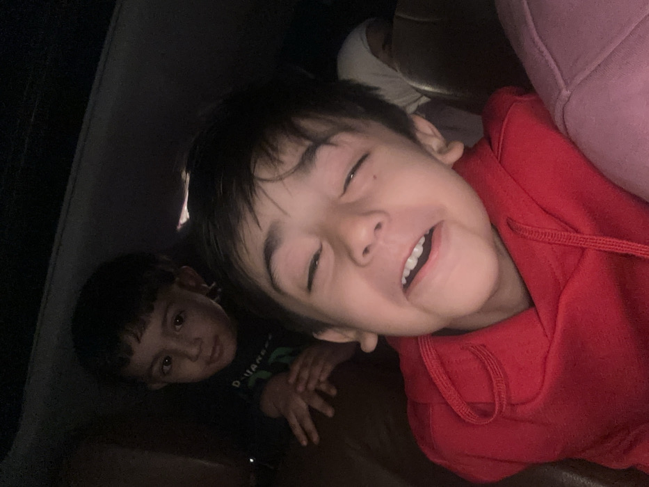 The image depicts three individuals inside a dimly lit interior, identified as Al-Mazza Municipality, Syria. In the foreground, a young boy, approximately 6-10 years old, wearing a red hooded sweatshirt, faces the camera with his eyes partially closed and mouth open in an expressive manner, revealing teeth. Directly behind him and to the left, a younger boy, approximately 2-4 years old, in a dark shirt with a green design, looks towards the camera with a neutral expression, his hands resting in front of him. Further in the background, to the right, a third individual with a light-colored head covering is partially visible. The immediate environment suggests the interior of a vehicle, characterized by dark upholstery and limited light sources.