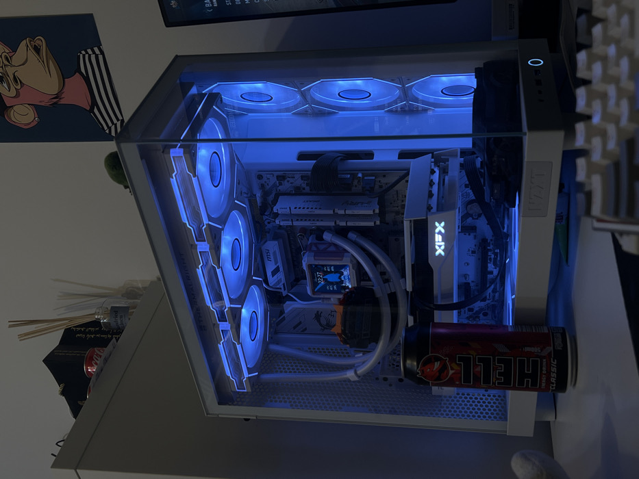 This image depicts an indoor scene in a room located in Bratislava, Slovakia, centered on a desktop computer setup. The primary focus is a white computer tower, displaying a transparent side panel that reveals internal components illuminated by prominent blue LED lighting. Three circular fans at the top of the case are lit blue, bearing the "THERMALRIGHT" label on their frame. Three additional vertically aligned fans on the front/side also emit blue light. Inside, an "MSI" logo is visible on the motherboard, and a white "XFX" logo illuminates the graphics card. A liquid CPU cooler block displays a small digital screen showing "22:27" and dynamic temperature readings, including "24°C", "45°C", and "41°C". The computer case features an "NZXT" logo on its front base. On the white desk surface, directly in front of the computer tower, a red and black "HELL Energy Drink CLASSIC 500ml" can stands upright. A small, dark-colored toy car rests on the bottom front edge of the computer case. In the foreground, a portion of a white mechanical keyboard is visible, out of focus. To the far right, a segment of a monitor displays blurred text against a dark background, indicating it is powered on. Above the computer, on a light-colored wall, hangs a framed artwork depicting a Bored Ape Yacht Club (BAYC) NFT character with pink skin and a black and white striped shirt. To the upper left, a white shelving unit or cabinet is partially visible, holding a black fabric bag, a red Coca-Cola can, and a glass diffuser bottle containing multiple reeds. A small, fuzzy green spherical object is positioned atop the computer case, near the wall art. No individuals are present in the scene.