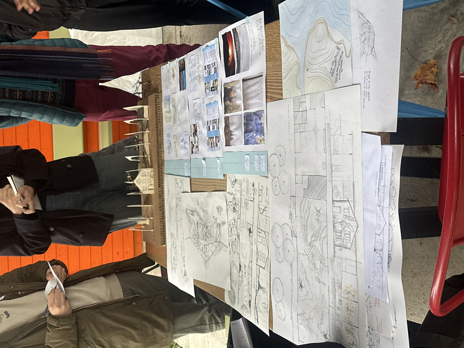 The scene depicts an outdoor architectural or urban planning review taking place at Square du Petit Édouard in the 19th arrondissement of Paris, France. Four individuals are partially visible, standing around a wooden table. The person on the far left wears a dark olive green parka over a light sweatshirt, holding a pen and a white notepad, appearing to take notes. The individual to their right wears a dark peacoat over dark jeans, also holding a small notebook and pen, with a ring visible on their left ring finger. The third person wears a dark teal puffer jacket, a multi-colored striped scarf, and burgundy trousers. The fourth individual, on the far right, wears dark pants and a dark top. The table is covered extensively with project materials. Centered at the back is a cardboard model of a small gabled building, surrounded by several smaller, stylized white structures on a corrugated cardboard base. The documents on the table include various hand-drawn architectural plans, landscape designs, urban maps, and topographical maps, some featuring contour lines and blue areas indicating water. Also present are multiple sheets arranged in a grid, displaying photographs, schematics, and text, with one document clearly visible stating "Le Square du Petit Edouard." The background features a vibrant orange wall, likely a building facade. A partial view of a red metal chair is in the lower-left foreground, and a blue metal chair leg is visible on the lower right, beside which a single brown, dried leaf rests on the ground. The arrangement of people and materials suggests an active presentation or critique of a design project.