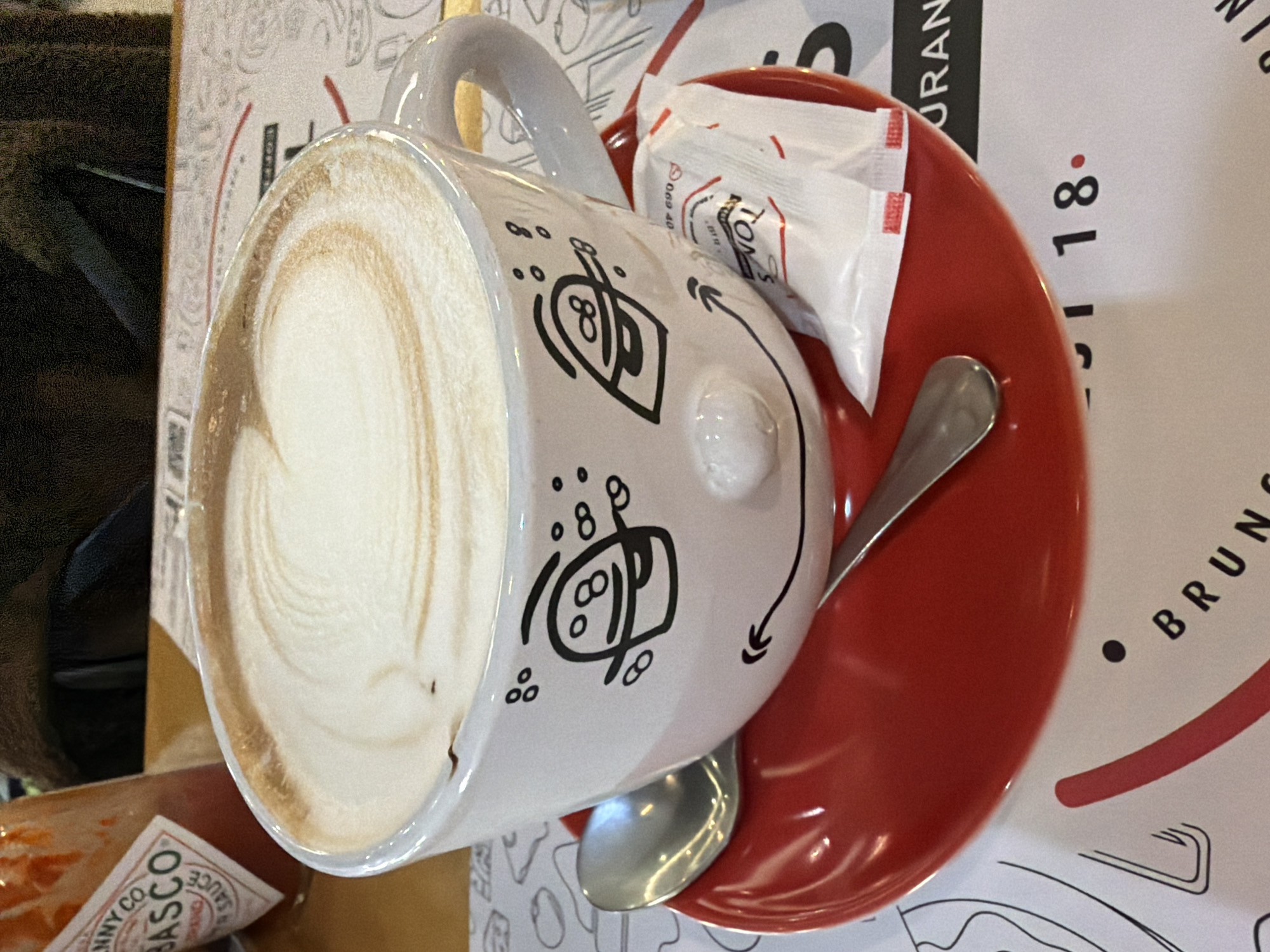 A white ceramic mug, decorated with a black cartoon face design featuring schematic eyes, eyebrows, a curved smile, and a raised ceramic nose, is centered in the frame. It holds a cappuccino topped with white foam and a light brown, multi-ringed latte art pattern. The mug rests on a glossy red ceramic saucer. A silver spoon and a white paper sugar packet, branded "TONI'S" in red text with a partial phone number (069 40...), are also on the saucer. These items are positioned on a white paper placemat displaying black line art illustrations and text, with the words "BRUNCH" and "URANT" clearly visible, indicating a restaurant setting. In the upper-left background, a glass bottle of red Tabasco hot sauce with its characteristic white label is partially visible. The scene takes place at Toni's, a restaurant and bar located in Tirana, Albania. No individuals are visible.