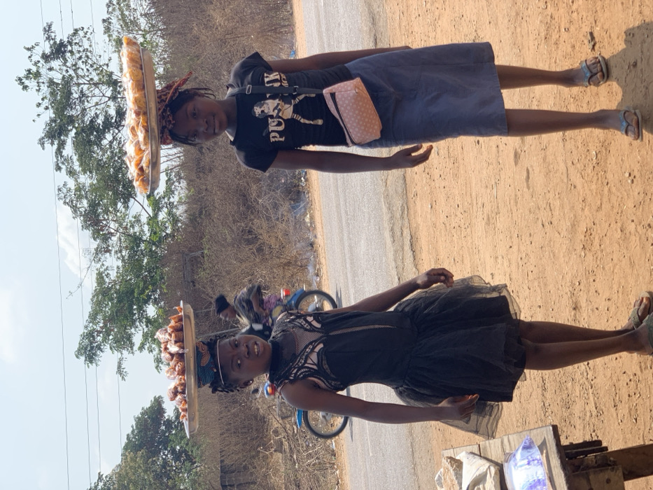 The scene is a bright, sunny outdoor setting along a roadside in Kabba, Nigeria