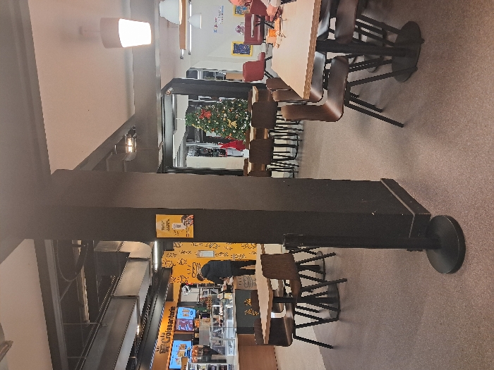 The image depicts an indoor space, possibly a cafeteria or food court. High tables with stools are present, suggesting a seating area. A Christmas tree is visible in the background, indicating a festive season. Signage for "Croissanterie" hints at the type of establishment. A person is seen near a counter, likely ordering food. The overall impression is a busy, casual dining environment.