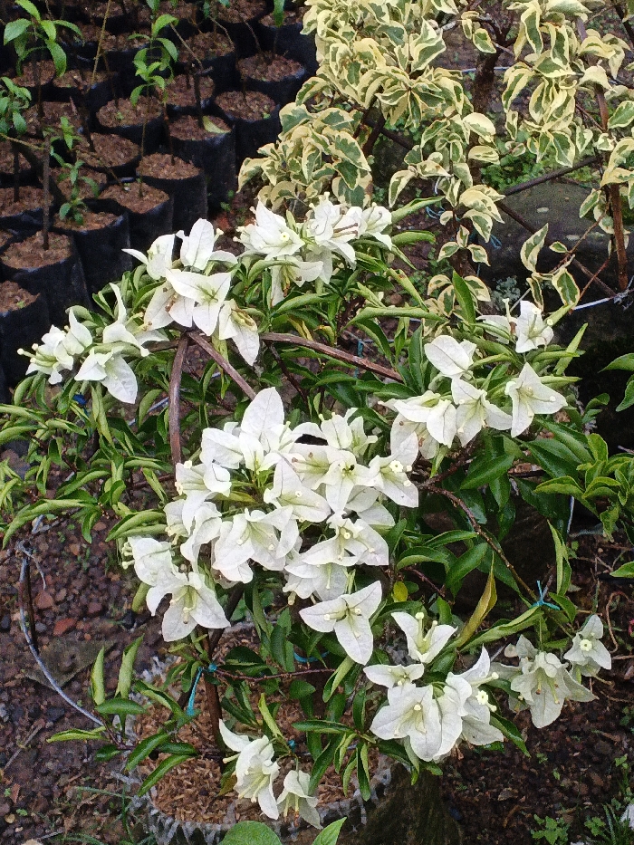This image depicts an outdoor plant nursery in Pea Reang District, Cambodia. A flowering white bougainvillea plant, characterized by numerous white bracts and dark green foliage, occupies the central and foreground area. Its branches are visibly trained or wired. To the left, a uniform arrangement of numerous small plants or saplings in black plastic polybags with dark soil is visible. To the right and slightly behind the bougainvillea, another plant with variegated green and cream-colored leaves is present. The ground consists of dark earth, scattered pebbles, and organic mulch. No individuals are depicted, and the scene is under natural daylight.