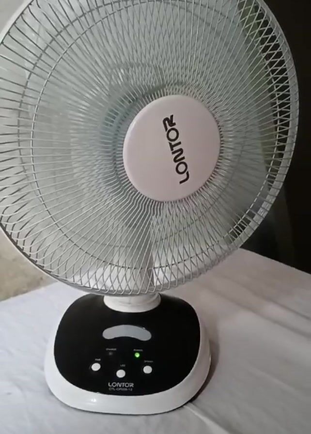 - "A white and black LONTOR portable fan is sitting on a white sheet or blanket" by FM-2kIWl2, licensed under CC BY 4.0