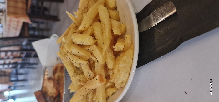 This image displays a table setting inside a restaurant or taverna located in the city of Penteli Municipal Unit, Greece. The primary subject is a large serving of golden-brown french fries, lightly coated with dried green herbs, presented on a white round plate positioned in the lower center. To the right, a black cutlery holder contains a silver-colored serrated knife. The table is covered by a white tablecloth. Behind the plate of fries, a metallic oval container holds several portions of a baked, light brown food item, possibly bread, and a folded white paper napkin. The background is blurred, revealing multiple dining tables draped with checkered tablecloths and dark wooden chairs, characteristic of an indoor dining establishment. No individuals are visible in the scene.