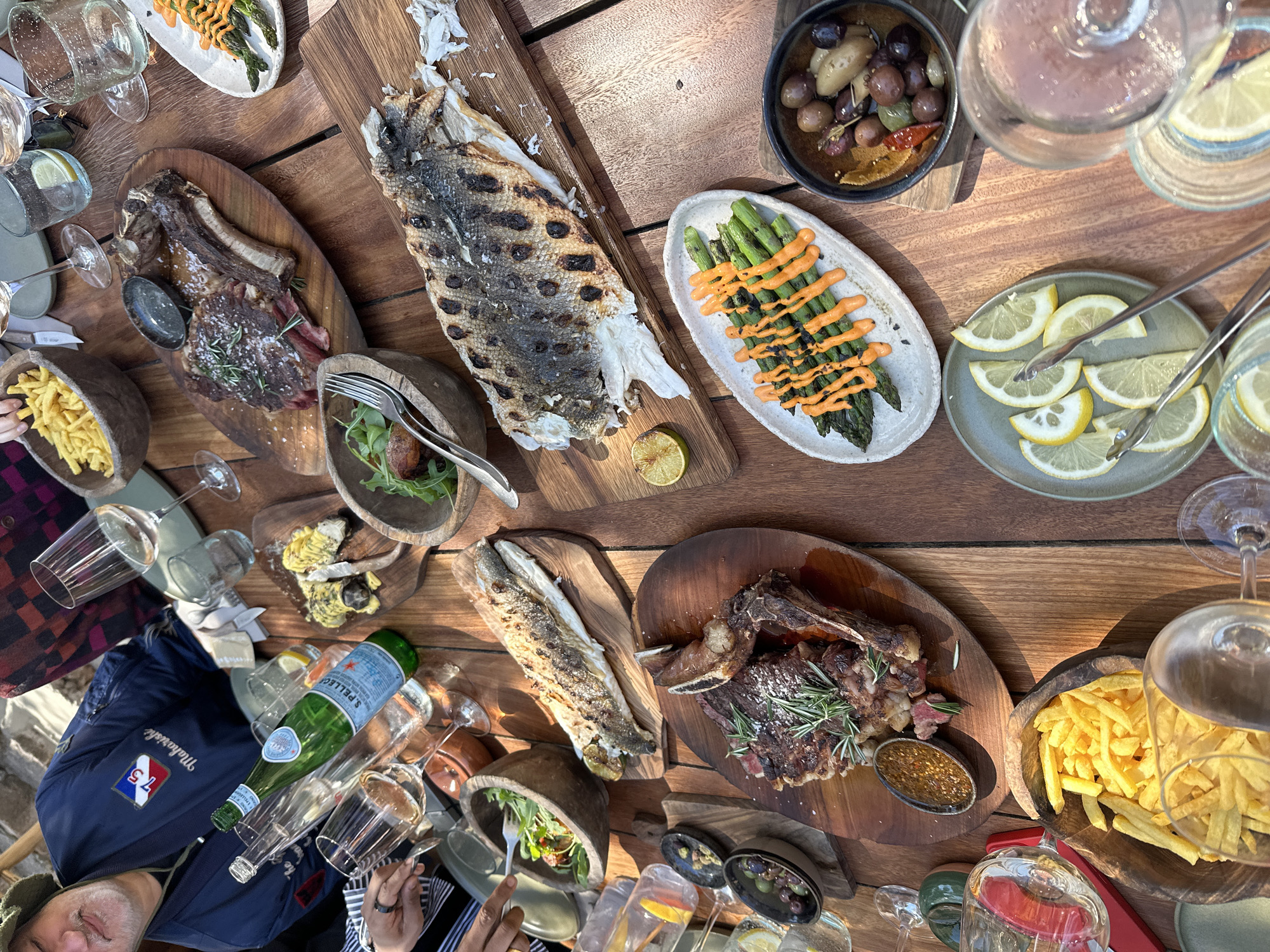 The image captures a table laden with food at a restaurant in Sant Antoni de Portmany, Spain. On the wooden surface, several dishes are visible: two grilled whole fish, two portions of steak, a bowl of french fries, a salad, asparagus with a drizzle, a bowl of olives and peppers, and plates of lemon wedges. There are multiple wine glasses, some filled with beverages, and a bottle of San Pellegrino mineral water. People are seated around the table, with parts of their clothing visible, including a jacket with an NBA logo. Forks and knives are placed near the dishes, indicating a shared meal in progress. The scene is brightly lit, suggesting an outdoor or well-lit indoor setting.