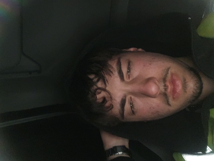 The image depicts a young adult male, seen from the chest up, in what appears to be a dimly lit interior environment, possibly a vehicle