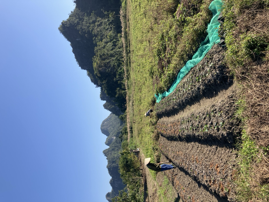 A landscape shows a vibrant farming area. Cultivated fields stretch diagonally across the frame, dotted with workers wearing conical hats. Green netting covers one section. In the background, lush green mountains rise against a clear blue sky. The scene is bathed in sunlight, highlighting the rich colors of the environment and the agricultural activity.
