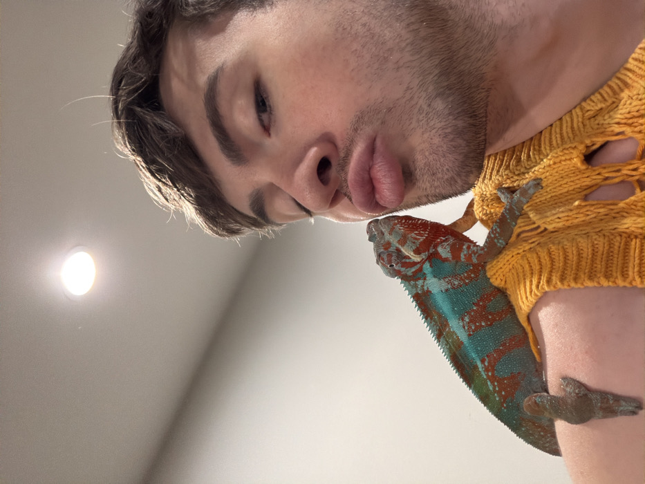 A man is kissing a chameleon. The chameleon, primarily blue and red, is positioned on his arm, which is clad in a yellow sweater with large holes. The man is looking down at the chameleon with pursed lips. His facial hair is trimmed close, and his hair is dark. A bright light is visible in the upper left corner. The background is plain and light colored.