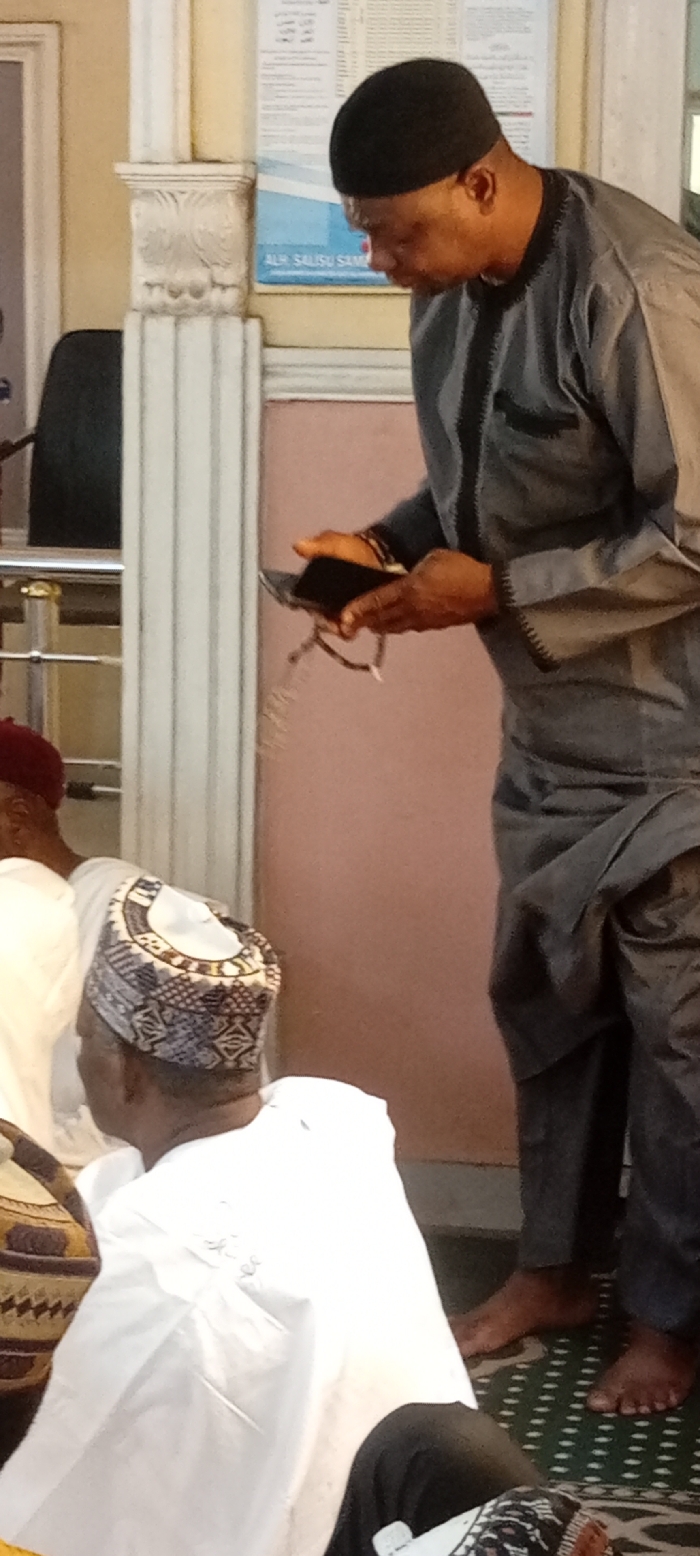 The scene depicts an indoor setting in Kaura Goje, Nigeria. A barefoot adult male stands prominently on a dark green prayer mat with light green textured patterns. He wears a black skullcap and a grey traditional Nigerian garment, consisting of a tunic with dark trim on the placket and cuffs, and matching trousers. His head is bowed, and his gaze is directed downwards. In his hands, he holds a black smartphone and a pair of eyeglasses, which dangle from his left hand. Dark-colored bracelets are visible on his right wrist. To the lower left, a seated individual is visible from the back, wearing a white traditional garment and a white patterned cap with grey and brown geometric designs. Further left, only the head of another seated individual is visible, topped with a red cap. A partial view of a third seated person's lower legs and feet, beside a patterned fabric, is at the bottom right. The background consists of a light beige wall transitioning to a light pink/salmon hue. A decorative white column with a carved capital stands to the left of the standing man. Behind him, a light blue poster with white text, 'ALR SALISU SAM', and white papers with Arabic script are affixed to the wall. A dark object, possibly a chair back, and a gold-colored metallic railing are partially visible on the far left.
