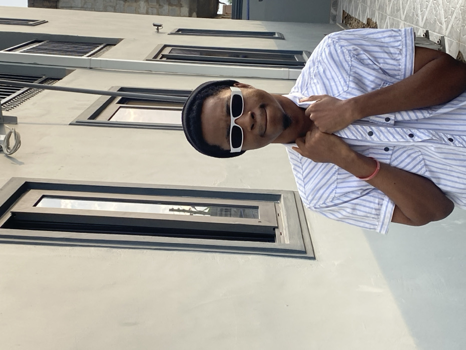 A young Black man in a black beanie and white-framed sunglasses poses in front of a light-colored building with dark-framed windows. He wears a short-sleeved, vertically striped blue and white shirt. His hands are raised near his neck. The photo is slightly tilted, with the building extending vertically from the left side of the frame. Sunlight creates shadows on the building's surface to the right of the frame.