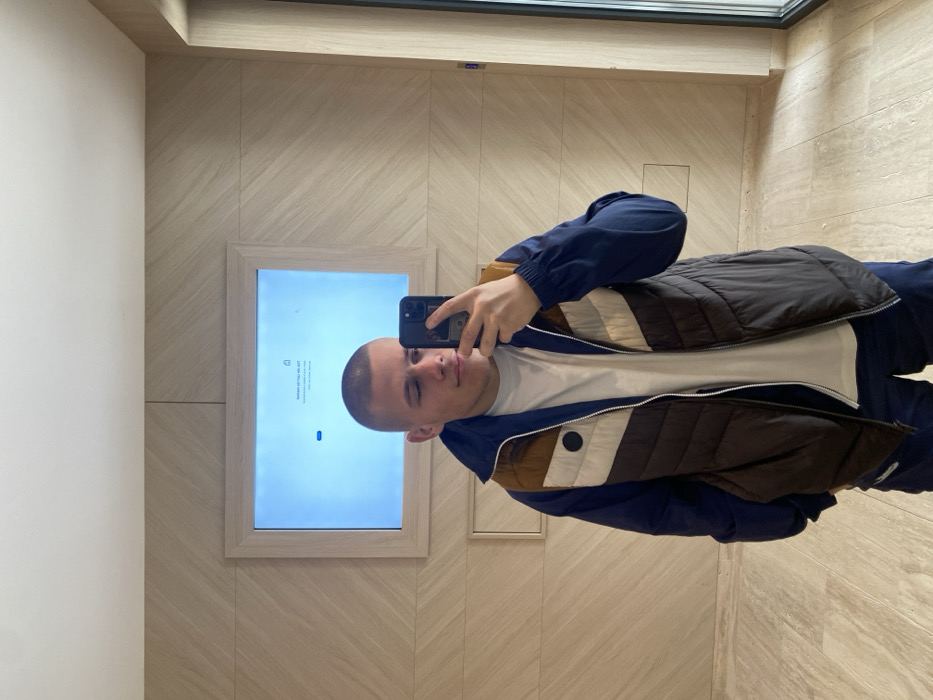 A young adult male with a buzz cut haircut is depicted in a full-body selfie, captured via reflection in a mirror or highly polished surface