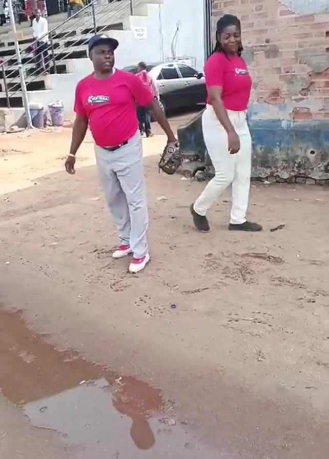 Two individuals, a man and a woman, both wearing red shirts, are standing in a dirt area