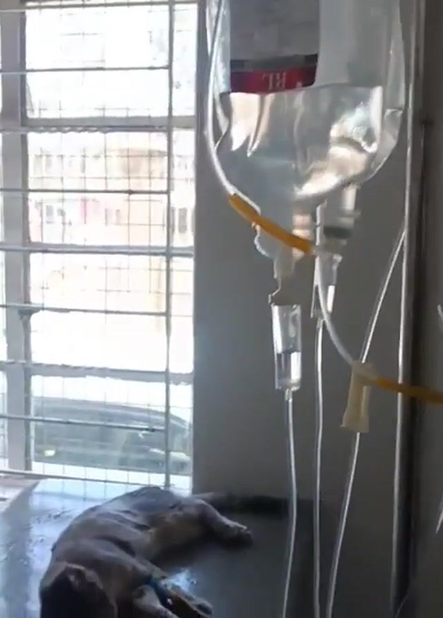 gray and white cat lying on a table in a veterinary clinic. The cat is lying on its side, its body limp. An IV is attached to one of its front paws. There are two bags of intravenous fluid hanging from a metal stand nearby. The background is blurred, but a window with a barred grid is visible. There is some green surgical drape and a used cotton ball next to the cat on the table. The lighting is bright and artificial. The general scene is somber and suggests the cat is receiving medical treatment.