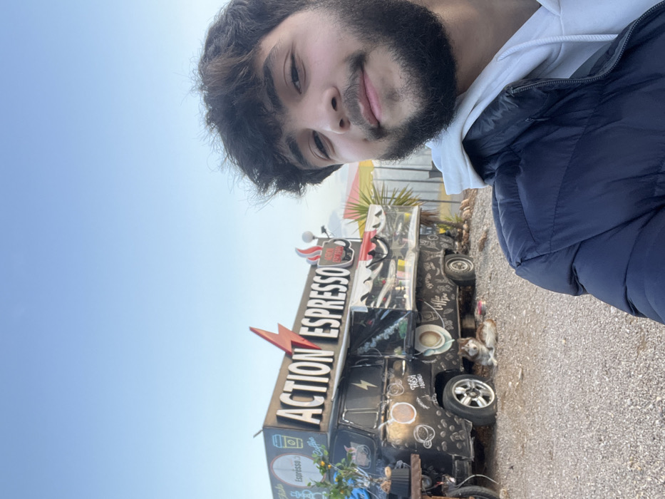 A young adult male, with dark, medium-length hair and a full dark beard, is depicted in a self-portrait. He is wearing a white hoodie beneath a dark blue puffer jacket and exhibits a slight smile. The background reveals a customized black food truck, presumably located in Qudsaiya, Syria, serving as a mobile coffee stand. The food truck, likely a converted van, features a prominent sign on its roof that reads "ACTION ESPRESSO" in white capital letters, accented by a red lightning bolt graphic between the words. The van's exterior is extensively decorated with white line art depicting coffee cups, coffee beans, and phrases such as "Fresh Beans" and "Coffee." An open serving hatch is visible on the vehicle's right side (viewer's left). A string of decorative lights is attached to the side of the truck. To the left of the van, a small plant with visible orange fruits, possibly citrus, is situated in a dark container. On the ground in front of the truck's left front wheel (viewer's right), a light-colored dog, resembling a Husky or Malamute with brown and white fur, lies on its stomach. The ground surface consists of light-colored gravel or small pebbles. The sky above is clear and light blue. In the distant background, behind the food truck, a tall, palm-like plant and a segment of a white corrugated metal fence or structure are discernible.