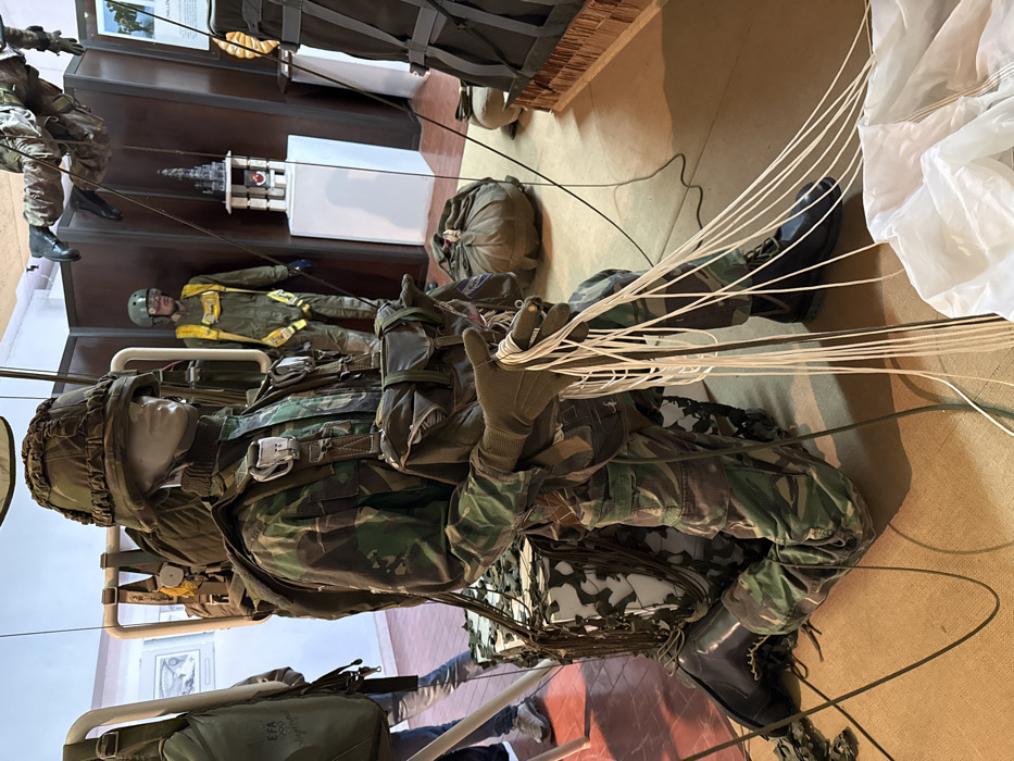 The image depicts an indoor military museum exhibit located in Praia do Ribatejo, Portugal. In the foreground, a mannequin is kneeling on a light-tan floor mat, dressed in a green and brown camouflage military uniform, helmet with a camouflage cover, olive-drab gloves, and black combat boots. It wears a full military harness with a large backpack and a chest-mounted pouch. Its gloved hands are holding multiple white parachute suspension lines that extend to a section of white parachute canopy fabric laid out on the floor, simulating the act of packing a parachute. To the mannequin's left, a camouflaged box or crate with attached cords rests on the floor. To the left of the central display, a portion of an olive-drab parachute container with "EFA 500" text is visible. In the mid-ground, another standing mannequin wears an olive-drab flight suit with a prominent yellow harness, helmet, and goggles. Further to the right and elevated, a third mannequin, dressed in camouflage, is suspended horizontally, depicting a parachutist in flight or descent. Between the standing and suspended mannequins, a white display pedestal holds a miniature gray architectural structure, possibly a castle, atop a wooden base, alongside a small red object. The museum environment features light-colored walls, dark brown partition walls, framed pictures on the background walls, and various packed parachute bags on the floor. The flooring transitions from a tiled section in the far left background to a consistent light-tan mat or carpet in the main display area.