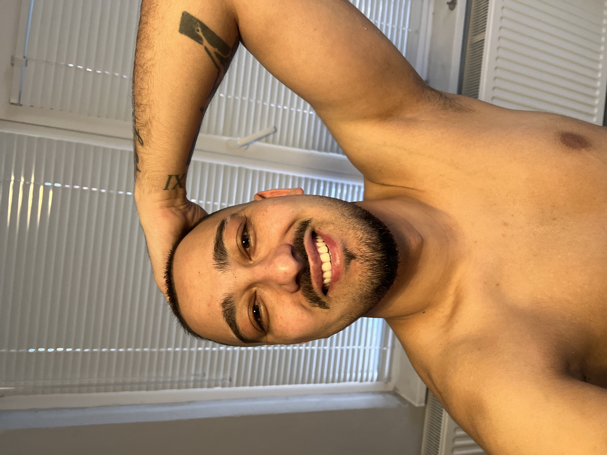 A shirtless man with a dark beard and mustache is smiling while holding his arm up, revealing tattoos on his arm and head. The man is standing in front of a window with white blinds and a radiator. The location cannot be determined.