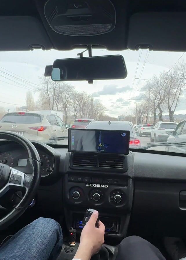 From the driver's seat perspective, the video shows a car stuck in heavy traffic on a city street. A dashboard-mounted smartphone is displaying a navigation app. The driver is seen fidgeting with a metal object in their hand, possibly a lighter or small tool. The car's dashboard features the word "LEGEND" above the climate control knobs. The sky is overcast, and bare trees line the road. Other cars are visible in front and to the side, indicating a busy urban setting.