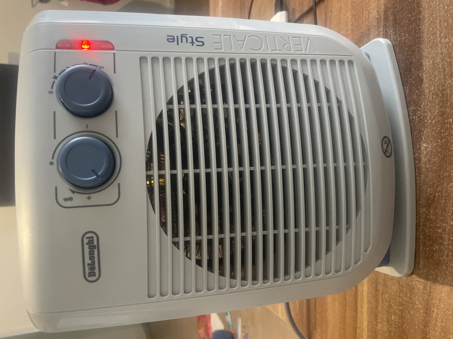 - "An electric fan heater, specifically a white DeLonghi "Verticale Style" model, is centrally positioned on a brown, mottled wooden surface in an indoor setting within the city of Strasbourg, France" by FM-tqCpG2, licensed under CC BY 4.0
