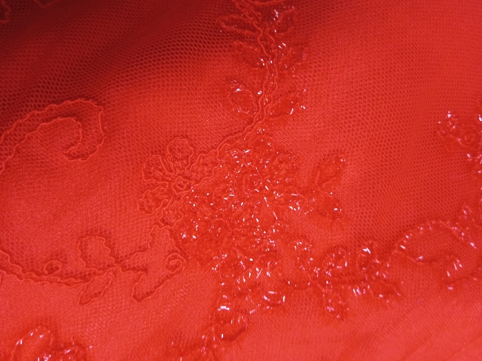 A close-up shot reveals a vibrant red fabric, likely a sheer net or tulle, adorned with an ornate floral design