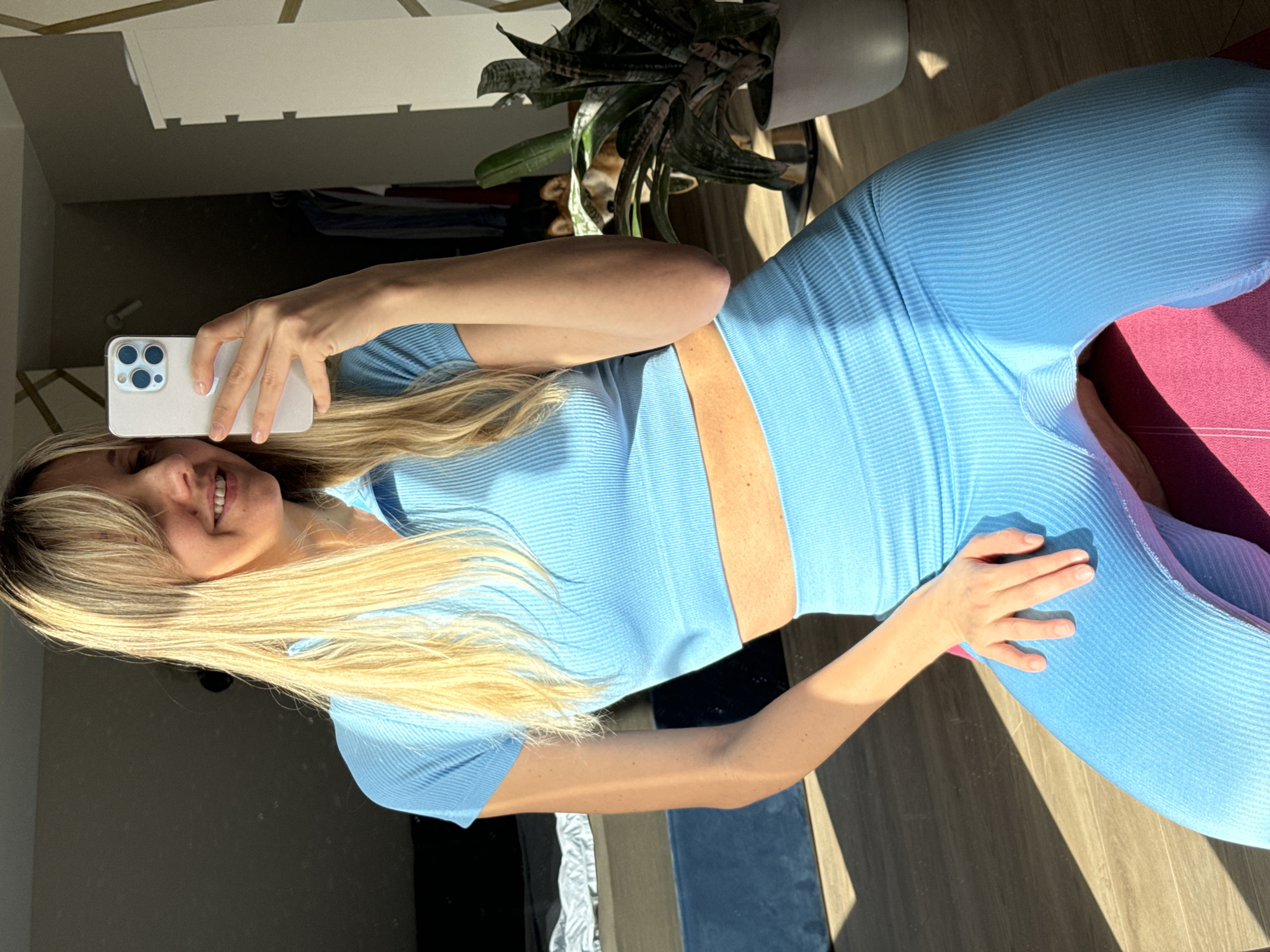 The scene depicts an indoor residential setting in Carnikava, Latvia. A fair-skinned female with long, straight blonde hair and bangs is the central subject, positioned in a low, seated stance on a pink exercise mat. She wears a light blue ribbed athletic two-piece set, comprising a short-sleeved crop top with a collar and matching leggings. Her right hand holds a light-colored smartphone, likely an iPhone due to the triple-lens camera array, aimed towards herself, indicating a selfie action. She is smiling. Natural sunlight streams from the left, illuminating the subject and casting shadows on the light-colored wooden floor. In the background to the subject's left, a dark wall and a bed with a blue headboard and patterned white/grey bedding are visible. To the subject's right, a potted Sansevieria plant in a white container sits on the floor. Behind the plant, a small dog with reddish-brown fur and pointed ears is partially visible. Further to the right in the background, a light-colored shelving unit or wardrobe containing hanging clothes is discernable, along with a reflective surface featuring geometric patterns.