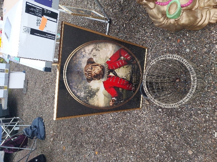 The scene, located in Eckbolsheim, France, depicts an assortment of objects arranged on a gravel surface. A prominent rectangular picture frame, gold-toned with a dark inner border, stands upright, displaying an oval portrait. The portrait depicts the head of a dog, possibly a Shar-Pei breed, atop a human body dressed in a red, collared jacket with white ruffles at the neck and cuffs, a white shirt, and a dark, possibly tricorn, hat. The background of the portrait features a muted landscape. Adjacent to the framed artwork, on the gravel, is a circular, open-top basket constructed from woven wire or thin metal strips. To the right of the basket, partially visible, is a golden statue, consistent with a Buddha figure, adorned with a pink beaded necklace and holding a green, cup-like object. In the upper left background, a dark blue duffel bag or backpack rests on the gravel near the exposed metallic frame of a folding chair. In the upper right background, a white cardboard box with visible black and orange labels sits on a metallic display stand, positioned next to a miniature architectural model of a house featuring white walls and yellow window frames. The entire ground plane is composed of small, irregular gray and brown gravel stones.