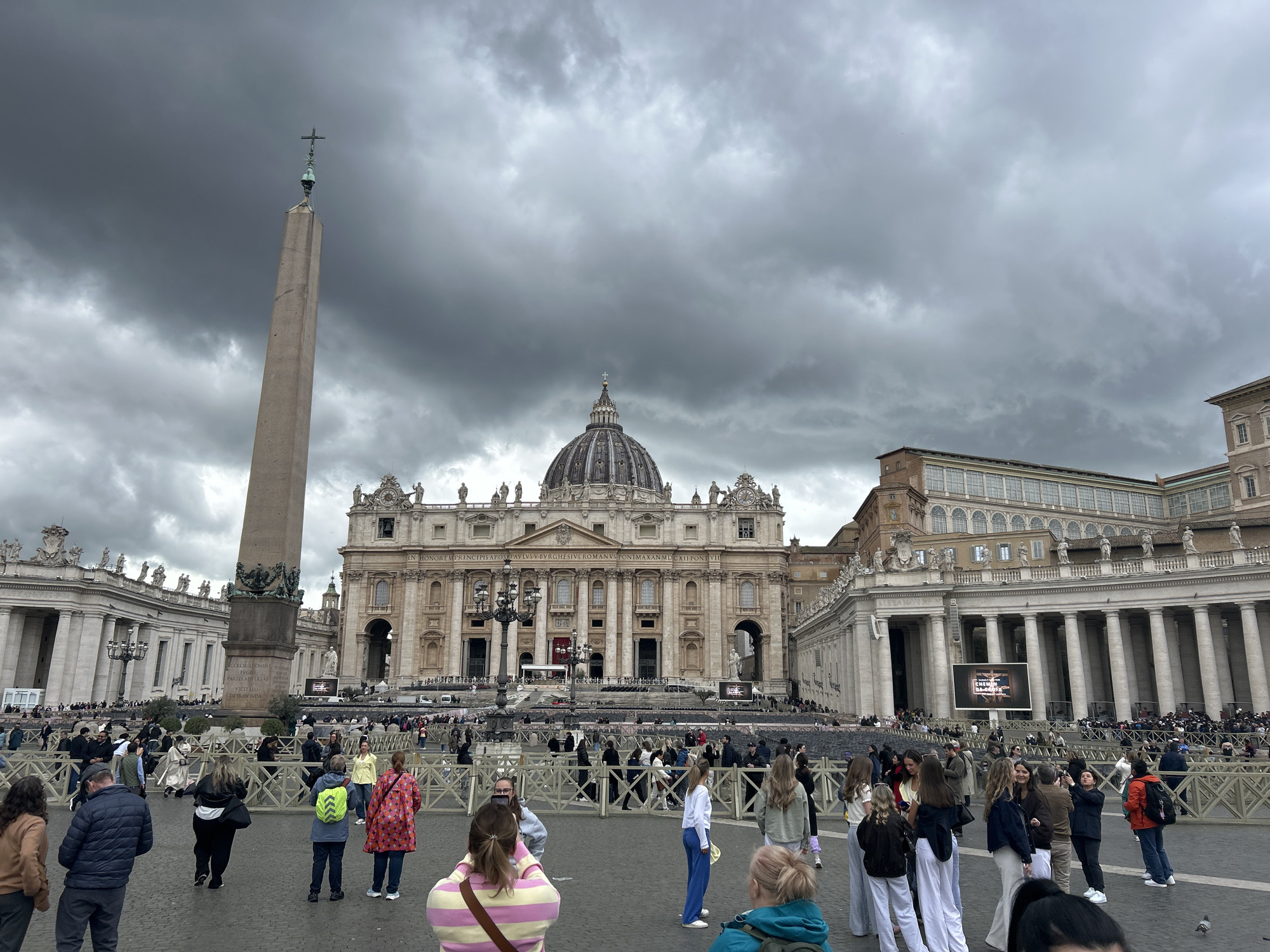 This image captures St. Peter's Square in Vatican City, an enclave within Rome, Italy, under a heavily overcast, dark grey sky. The vast cobblestone piazza is densely populated with a large crowd of individuals. In the background, St. Peter's Basilica stands prominently, a grand Baroque and Renaissance structure featuring a large central dome, an ornate multi-tiered facade, and numerous statues along its roofline. To the left of the basilica, the Vatican Obelisk rises tall, a monolithic stone pillar topped with a cross. The semi-circular colonnades of St. Peter's Square flank the scene on both sides, adorned with additional statuary. Numerous cream-colored, X-shaped crowd control barriers delineate sections of the piazza, segmenting the large gathering. Two large black video screens are visible in the mid-ground; one clearly displays an image of a crucifixion scene with accompanying text. Ornate black lampposts are interspersed throughout the square. Hundreds of people, primarily adults and young adults of mixed gender, are present across the piazza. Many individuals in the foreground are seen from behind, facing towards the basilica, suggesting observation or anticipation. Other groups are standing, walking, or engaging in conversation. Several individuals are holding mobile phones, indicating they may be taking photographs or videos. Attire is casual and layered, consistent with moderate to cool weather. No overt distress or conflict is visible. The scene depicts a public gathering or event at a major religious and historical landmark.