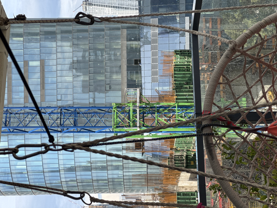The image depicts an urban landscape in Givatayim, Israel, viewed from a high vantage point, likely a balcony. In the immediate foreground, part of a light-colored rope macrame hanging chair is visible, suspended by multiple ropes and metal carabiners. A black horizontal railing and a clear glass balcony barrier run across the lower mid-section of the frame, showing reflections and hints of greenery below. Beyond the railing, a large construction site is active. Concrete structures with extensive exposed orange-colored rebar are prominent, alongside green modular formwork panels. A tall blue tower crane mast is centrally located, with its green base structure visible at a lower level within the construction zone. In the background, a large, modern, multi-story building with a gently curved, reflective blue-tinted glass facade dominates the left and center. Reflections of the sky and other unseen structures are visible on its surface. To the far right, a distinct white, angular, multi-story building is partially visible in the distance. The sky above is overcast. No people or specific actions are discernible.